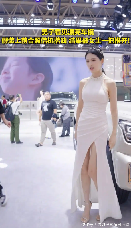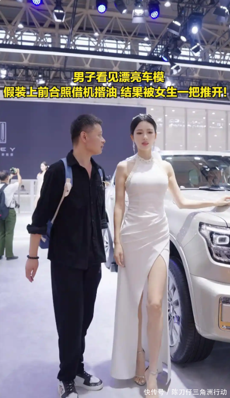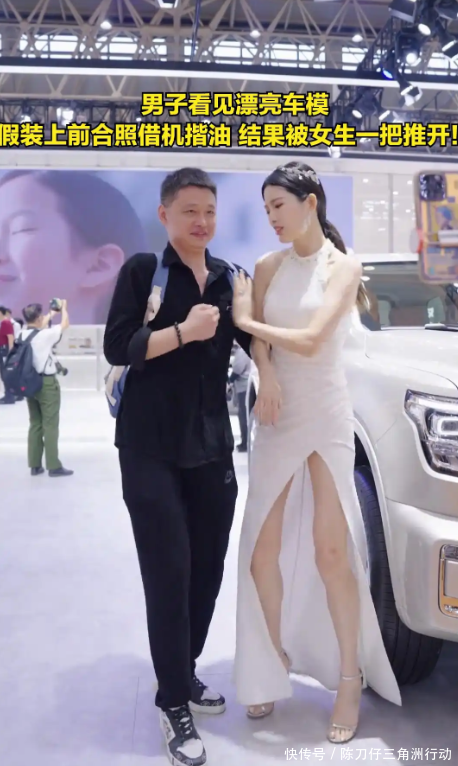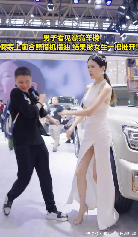 男子看见漂亮车模,假装上前合照借机揩油,结果被女生一把推开!